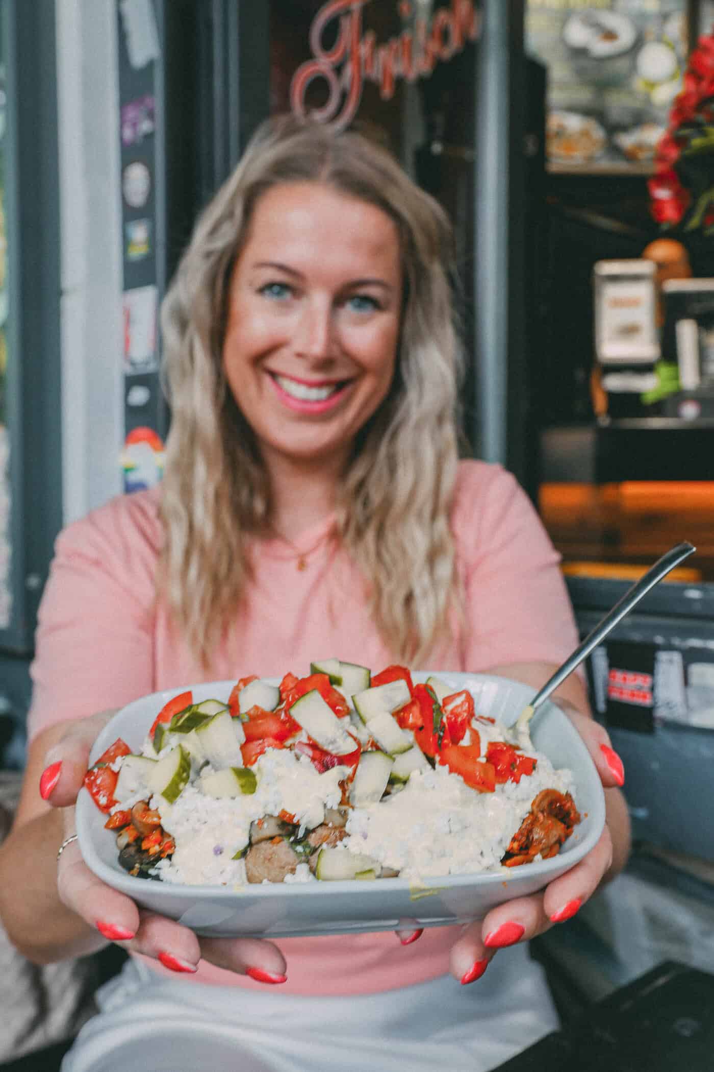 Mein erstes Ziel: ein heißgeliebter Klassiker aus der Streetfood-Welt: Kumpir. Diese riesige, fluffige Ofenkartoffel wird randvoll mit allerlei Leckereien gefüllt. Ich entscheide mich für eine Variante mit Feta, Couscous, frischem Gemüse und einer ordentlichen Portion Soße. So einfach, so gut!