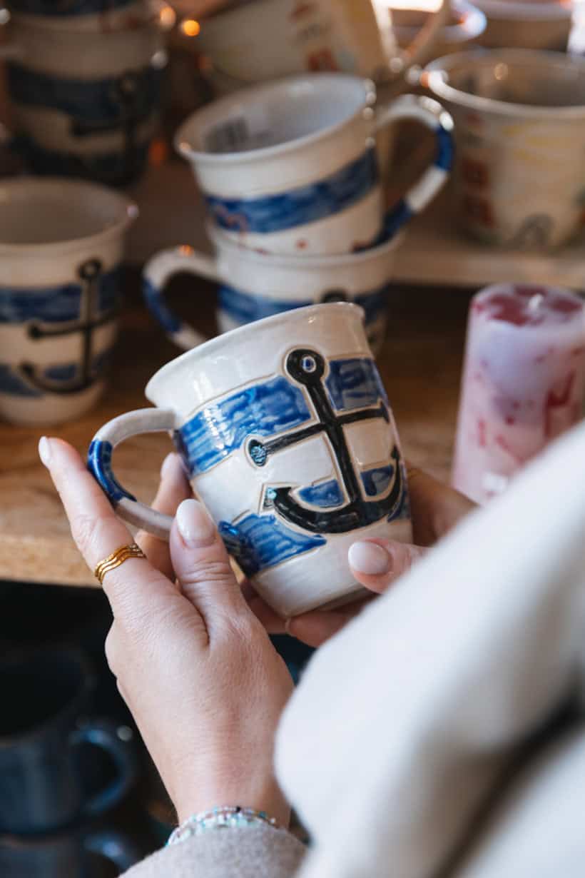 Nach unserer Zeitreise im Wallmuseum, holen wir uns im TalenteHaus gedanklich wieder zurück in die heutige Zeit. Der Laden ist an eine Manufaktur von Menschen mit Behinderungen angegliedert, die hier Kerzen und Keramik in liebevoller Handarbeit herstellen. Wir stöbern durch lustige Dekoartikel, maritimes Allerlei und süße Geschenkideen. Und weil man nie genug schöne Tassen im Schrank haben kann, suchen wir uns natürlich noch eine der handgemachten Tassen aus. Ein Souvenir an diesen tollen Tag!